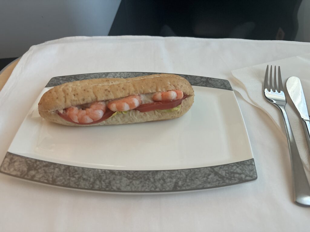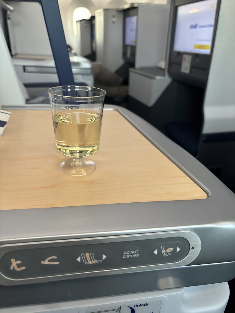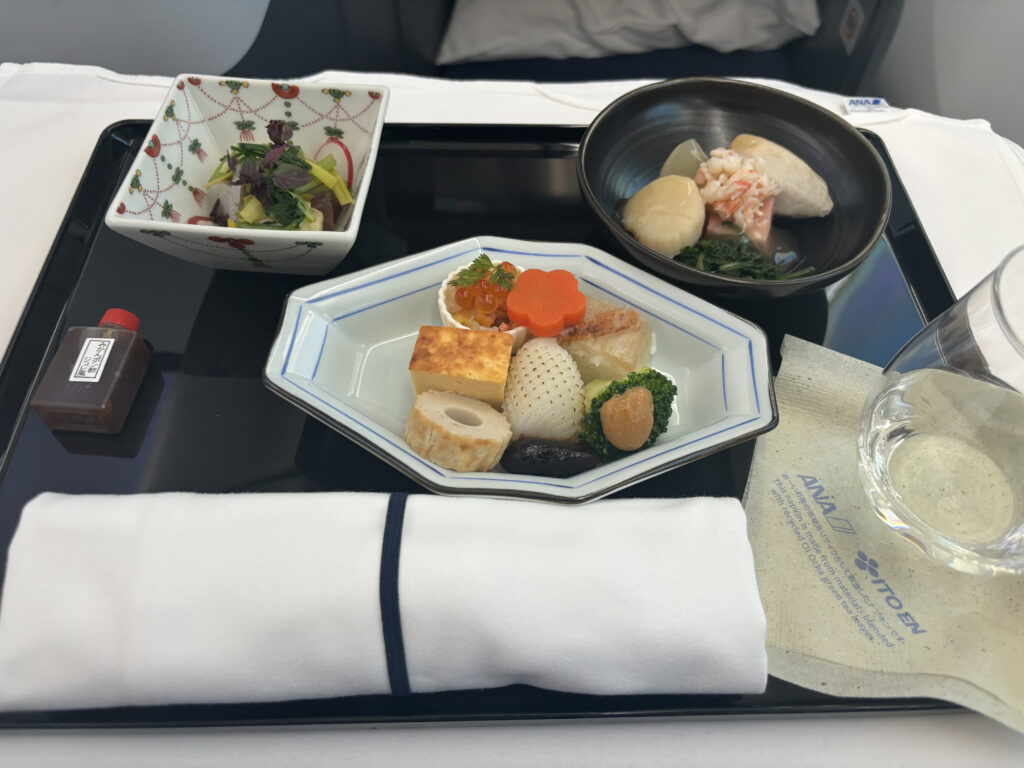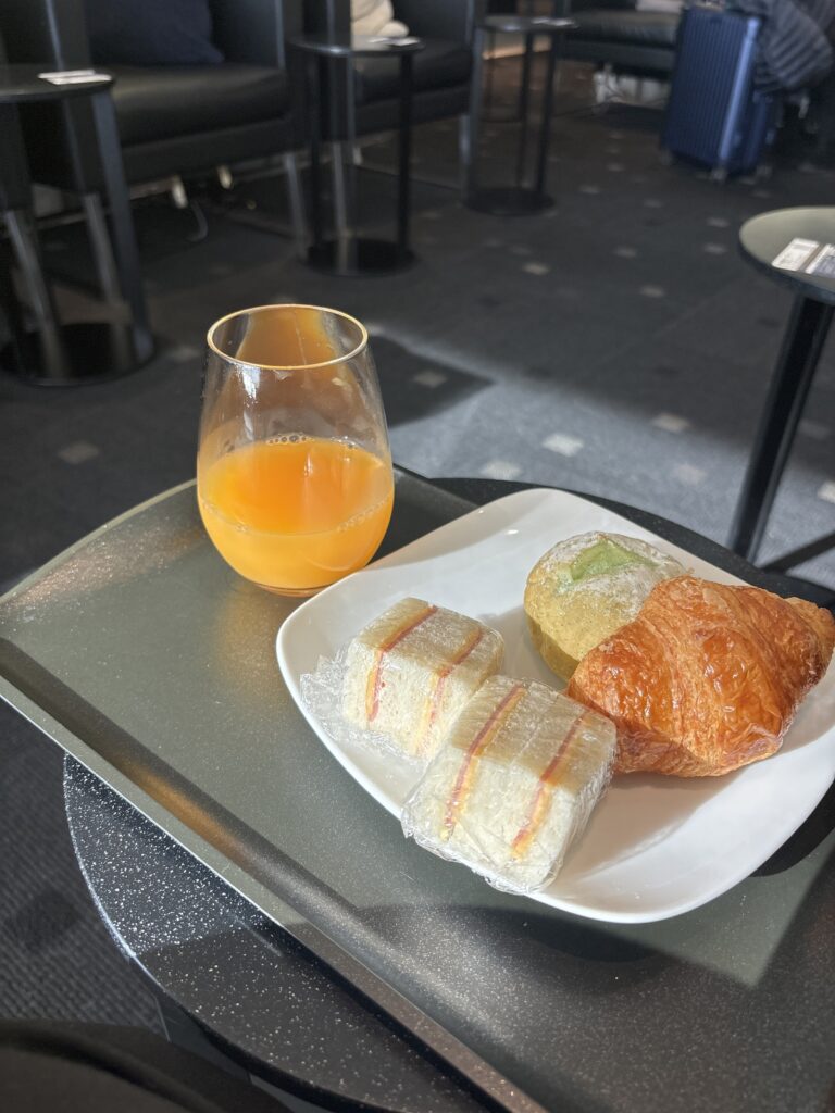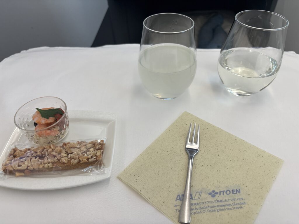 ウエルカムドリンクです。シャンパンもプラスチックのグラス風カップで提供です。これ、日系以外でプラスチックに遭遇したことがないのですが、国交省の指示とかによるものなのでしょうか…?