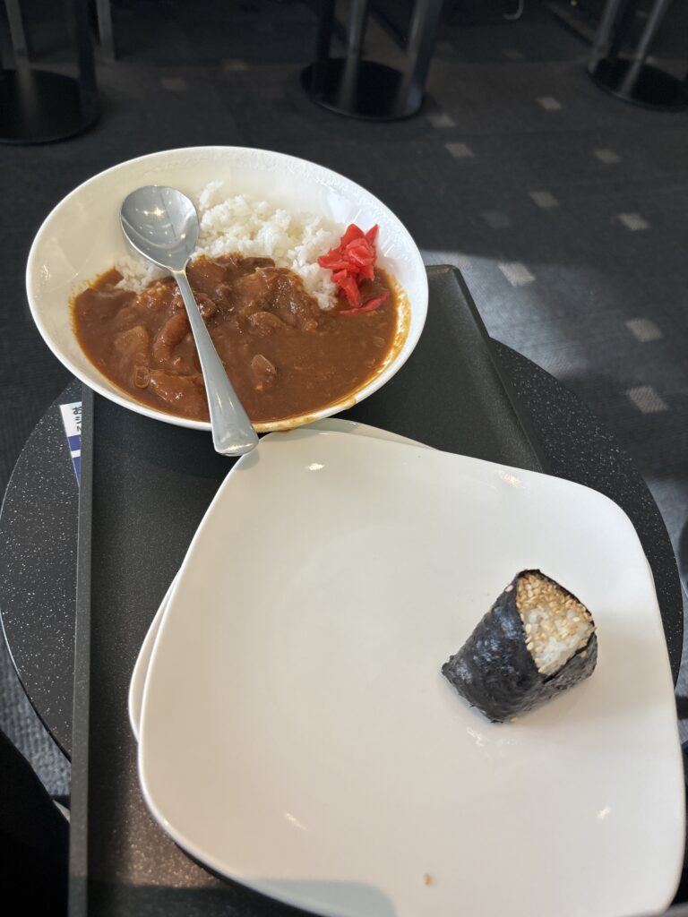 文句をたれながらも一通り食べます。小ぶりのおにぎりとカレーです。