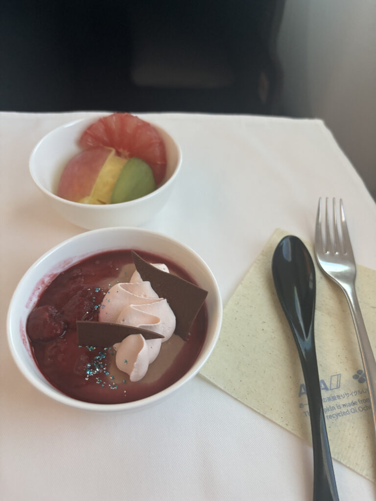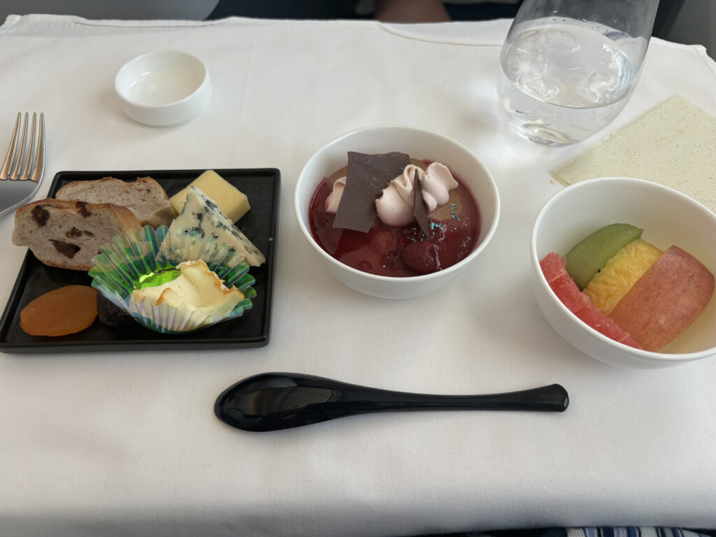 デザートは3種類全部いただいて終了。他社と比べても、チーズがちょっと凝っているのは良いですね。和食は全体として、噂通りのレベルの高さを見せつけられました。